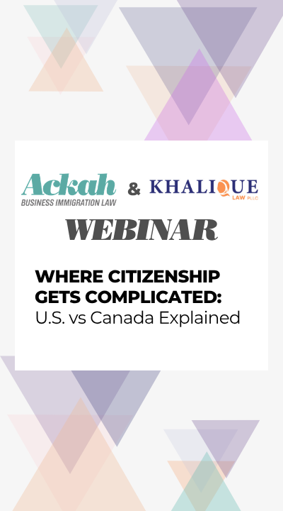 Sign up for reminders to our Where Citizenship Gets Complicated: U.S. vs Canada Explained Webinar co-hosted by Evelyn Ackah of Ackah Business Immigration Law and Sumaiya Khalique of Khalique Law. This webinar is designed for people exploring cross-border citizenship. Click on the image below to sign up for reminders for the webinar on April 22, 2026.
